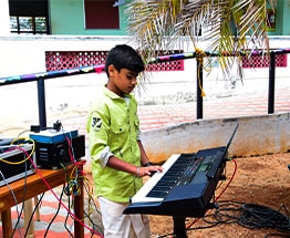 Students learn and perform musical instruments like guitar, keyboard, drums and traditional instruments, fostering musical skills and artistic expression.